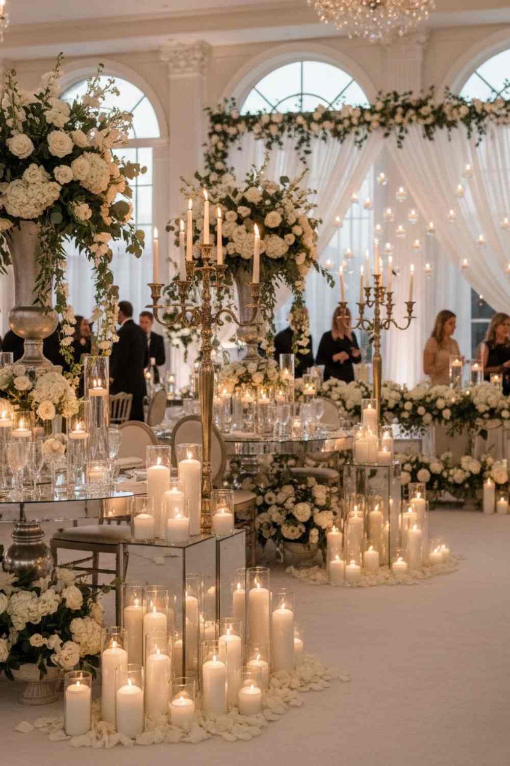 Playing with height makes your décor feel more dynamic and expensive. Tall floral arrangements, floor standing candelabras, or layered candle clusters at different levels all help to fill a room — especially if you’re working with high ceilings.