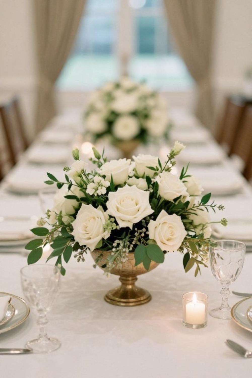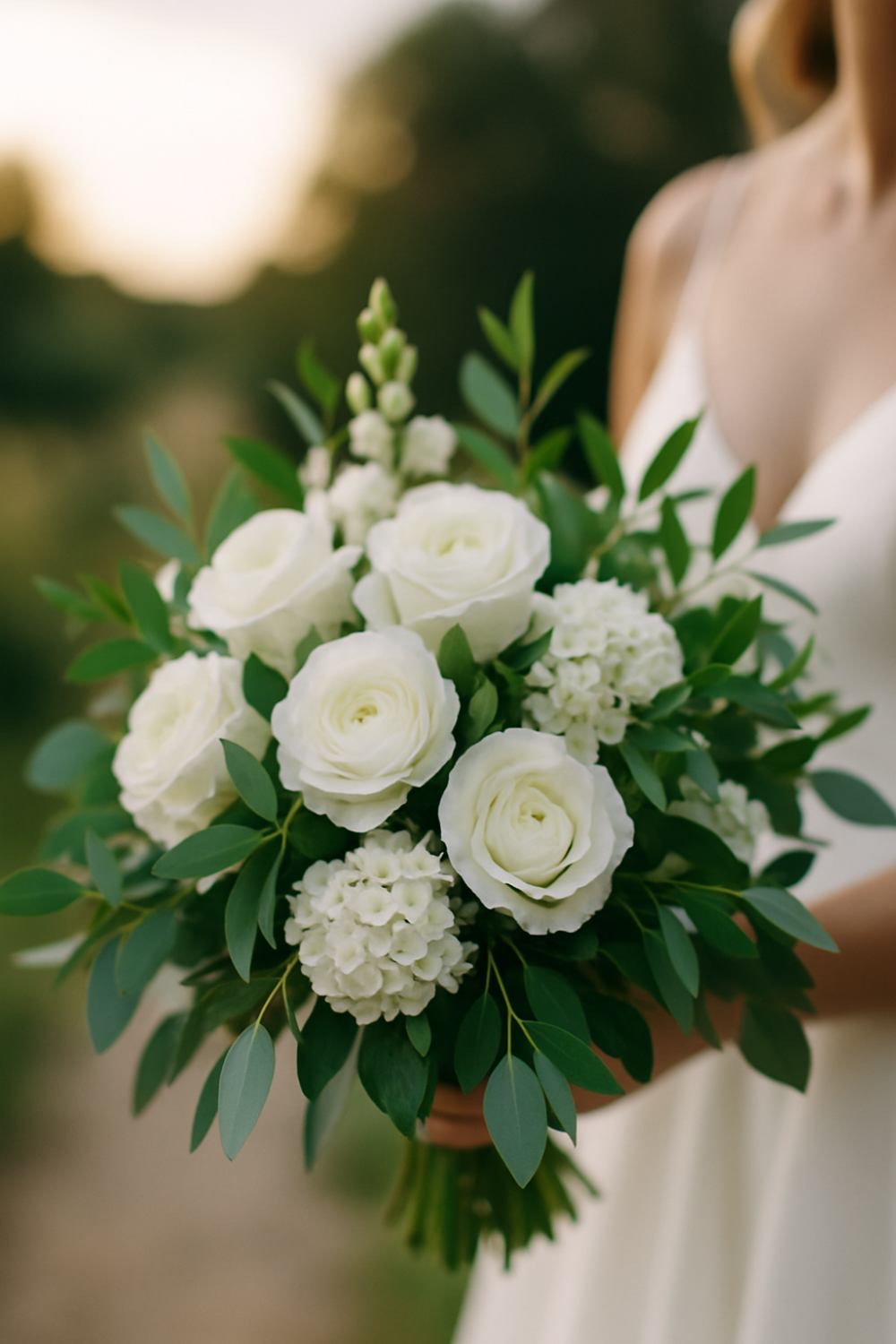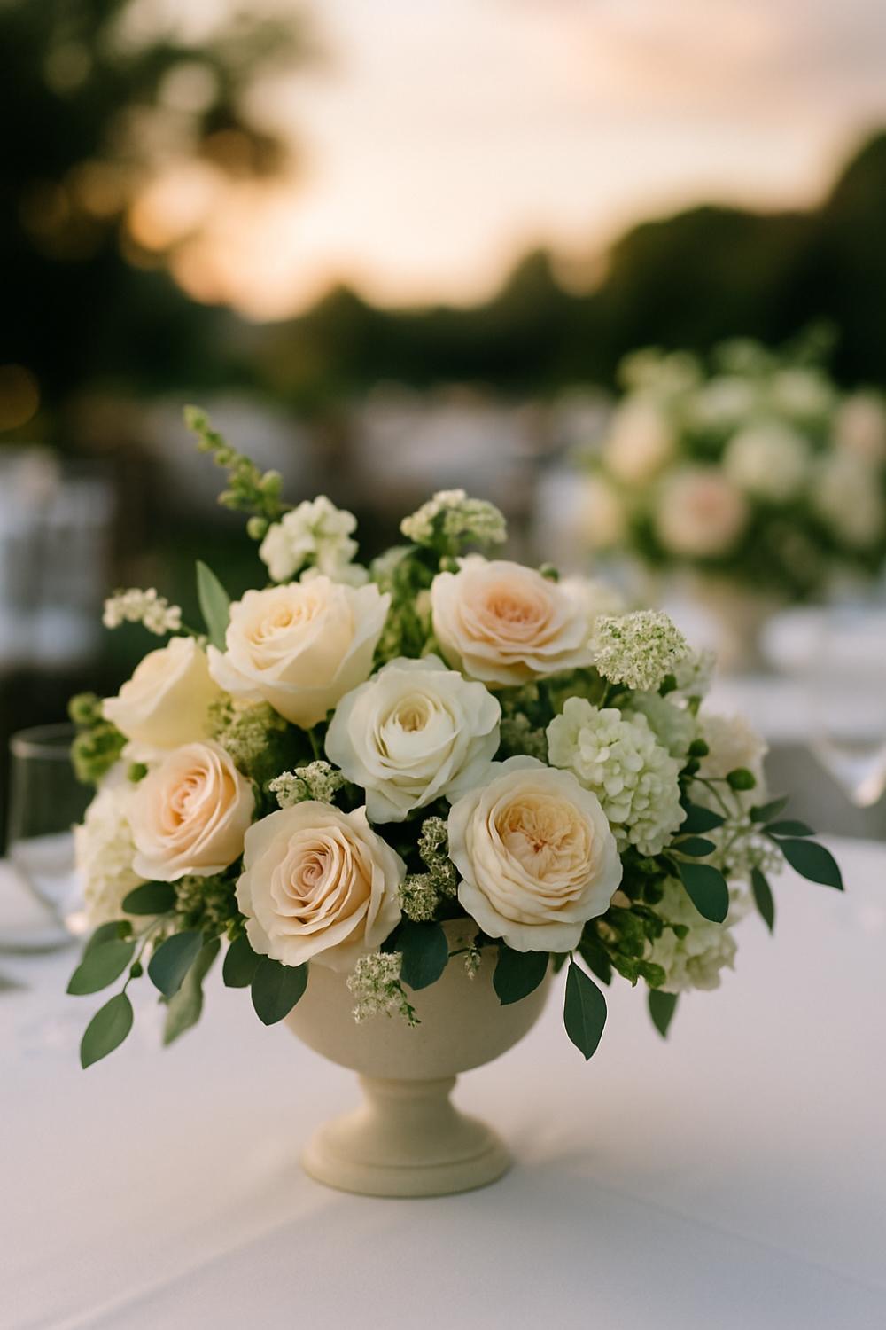 White flowers also go beautifully with almost any bridesmaid dress color, table linen or venue style. Adding different types of greenery — like eucalyptus, ruscus, or olive branches — makes the whole thing look more full without overdoing it with too many colors.