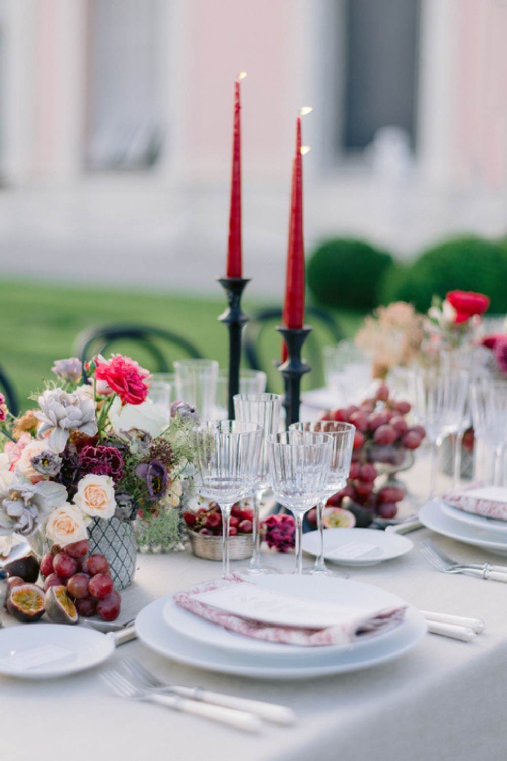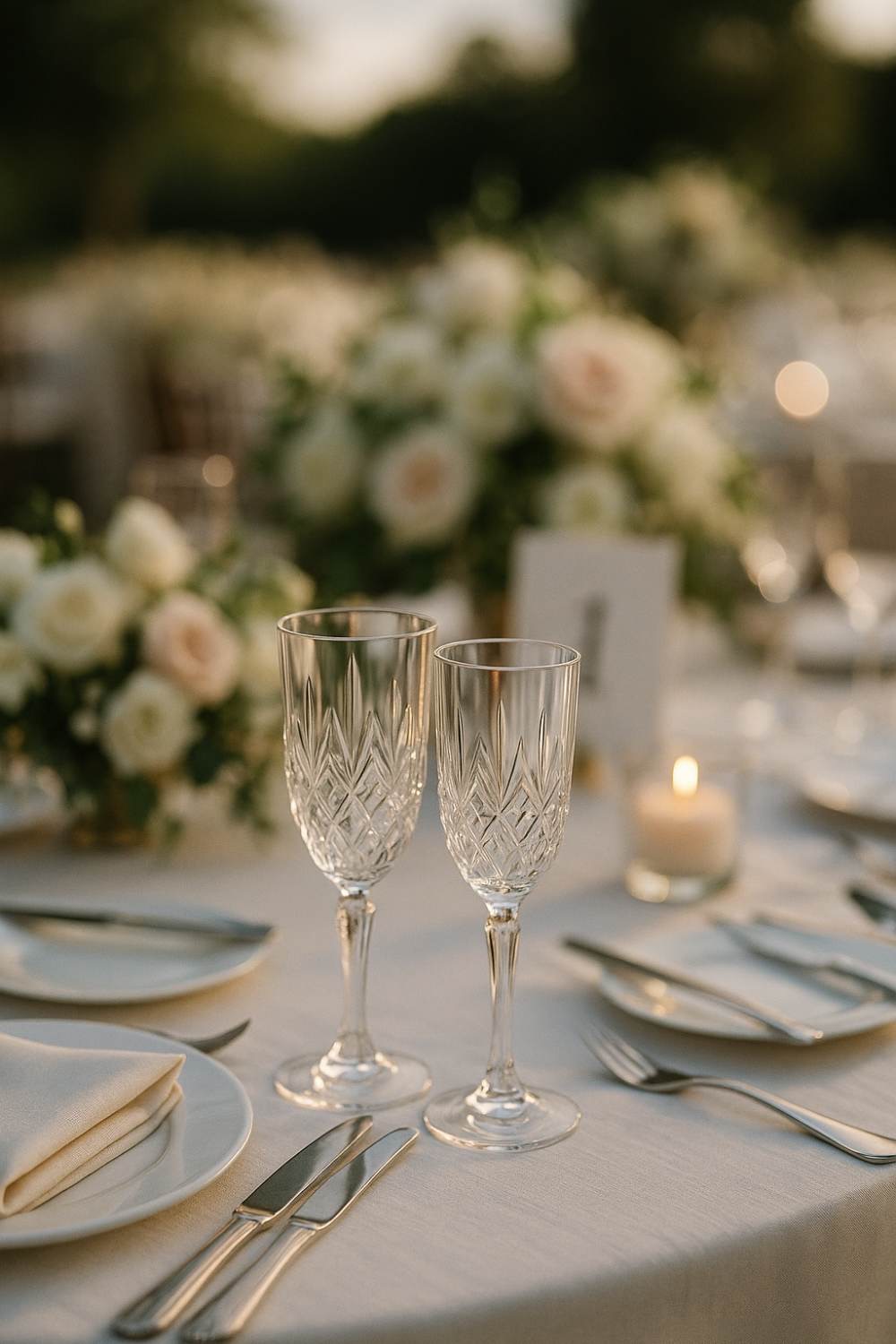 Glassware can change the entire mood of a table. Crystal or etched glasses catch candlelight beautifully and look refined in photos.