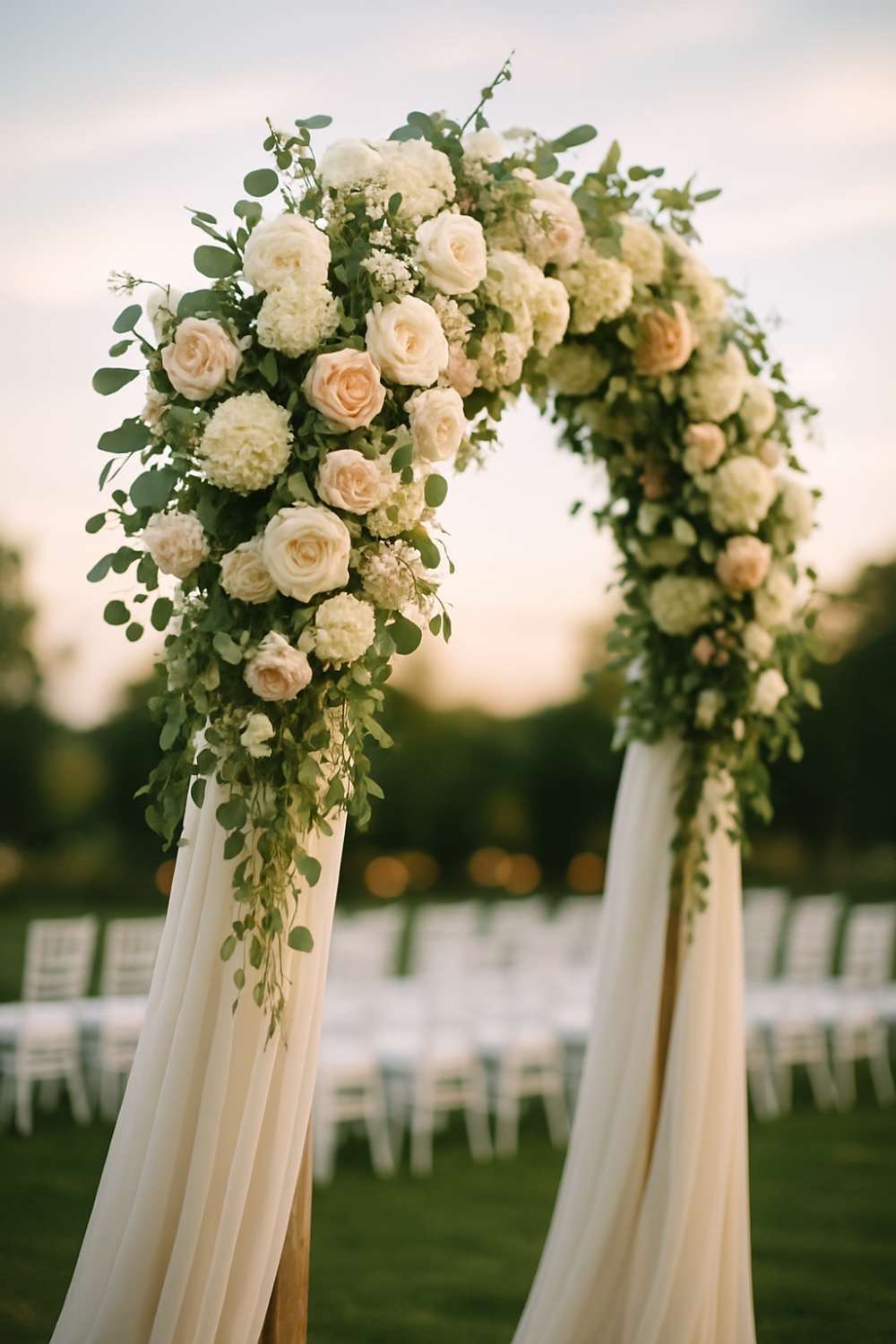 A ceremony arch is often the main focal point of your entire wedding day as it’s in nearly every photo from your vows. To make it elegant choose a floral frame or arch that feels full and lush.