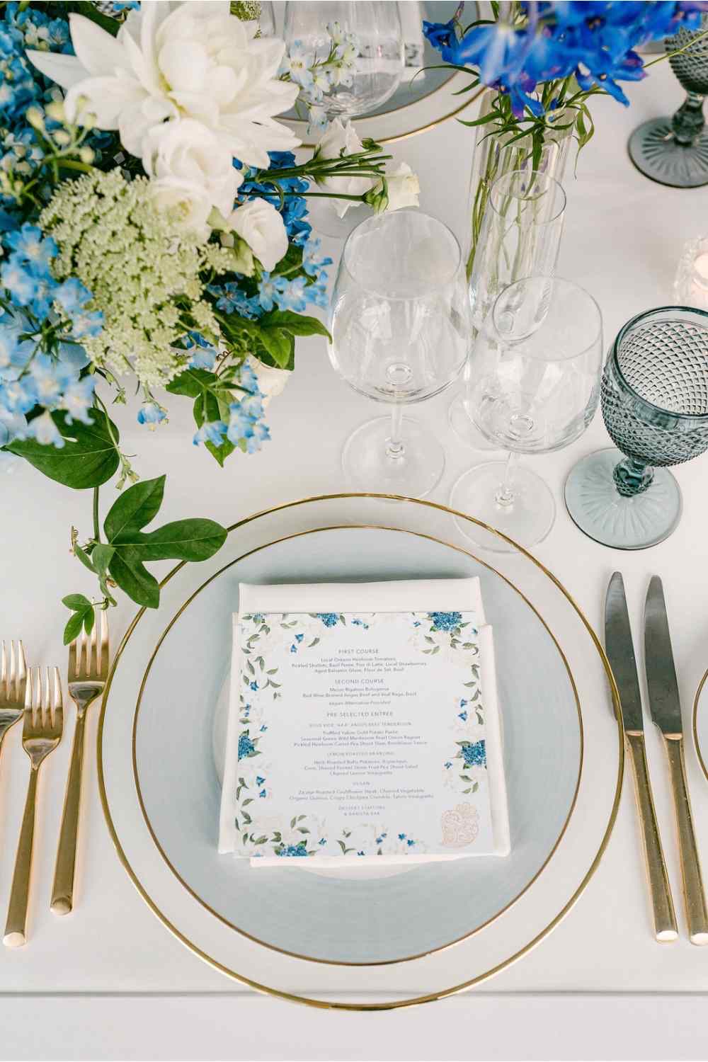 If you can’t spend big on everything then pick one part that really takes your entire table up a notch. This might be upgraded linens, gold flatware, crystal glassware, coordinating menus etc. Even one upgrade can make your whole setup look a lot more elegant.