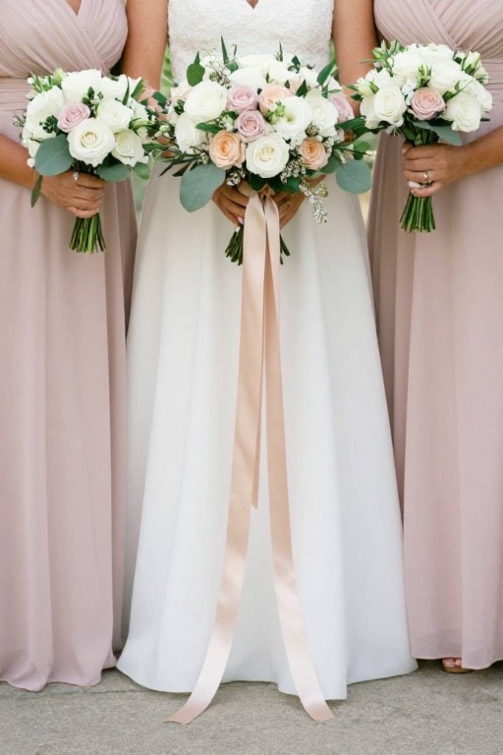 One of the easiest ways to add some elegance is with long, flowing ribbons on your bouquet and bridesmaids’ bouquets. Silk or satin ribbons in soft tones that trail down will look wonderful in photos.