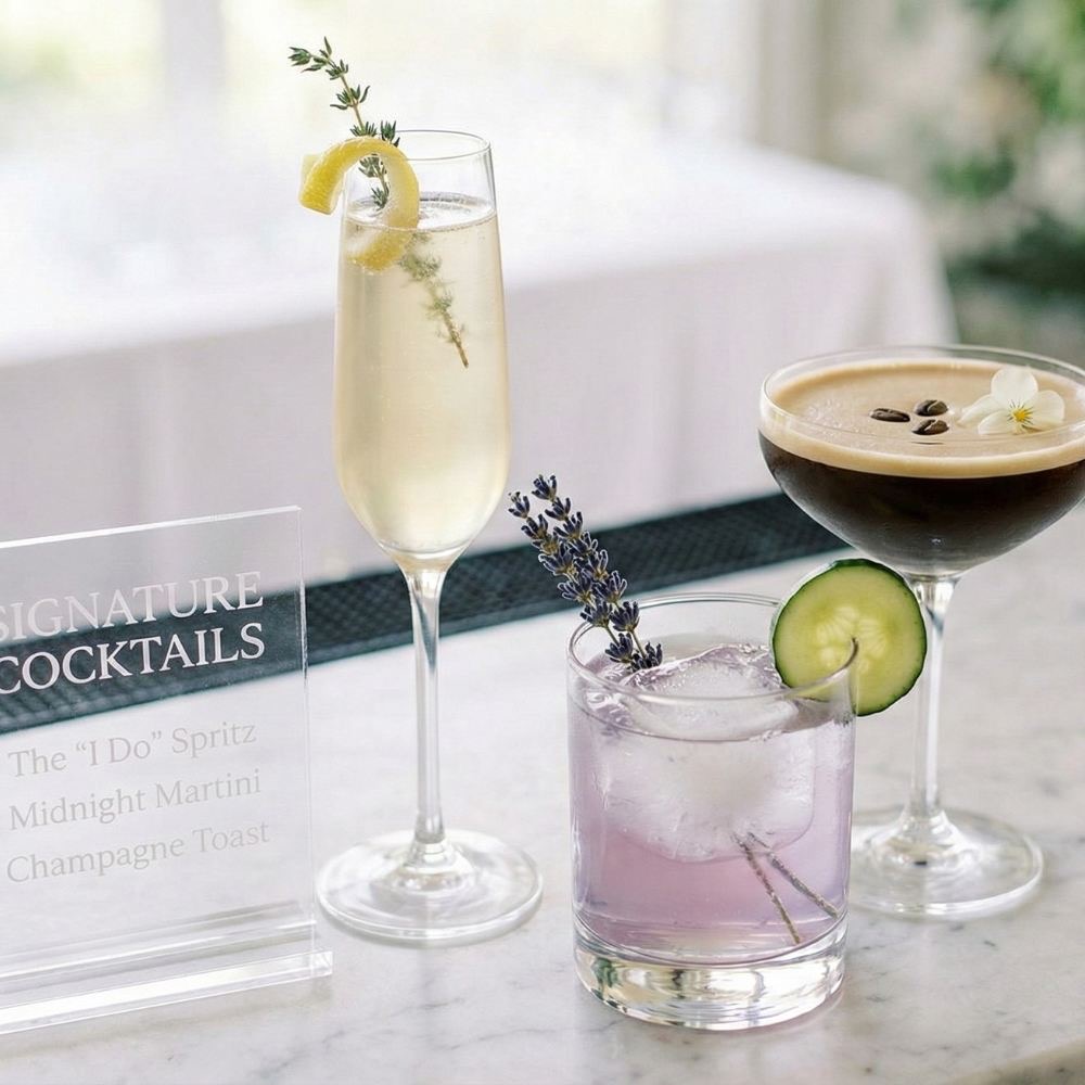 Signature cocktails can look elegant when styled with minimalist glassware, fresh herbs or a single edible flower. Skip the bright colors or novelty garnishes as they can look a bit tacky. Instead you want champagne cocktails, lavender spritzers, classic espresso martinis etc. A small acrylic cocktail sign with clean typography brings it all together.