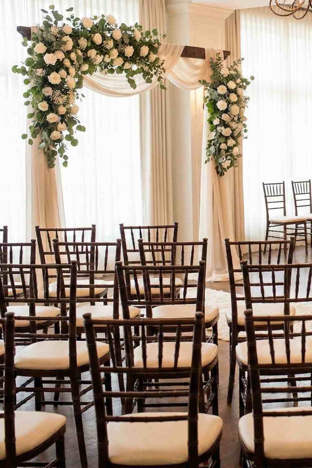 Standard straight rows work well but a curved or semi circle seating layout can make your ceremony feel more intimate and elegant. This setup brings guests closer and frames the couple beautifully.