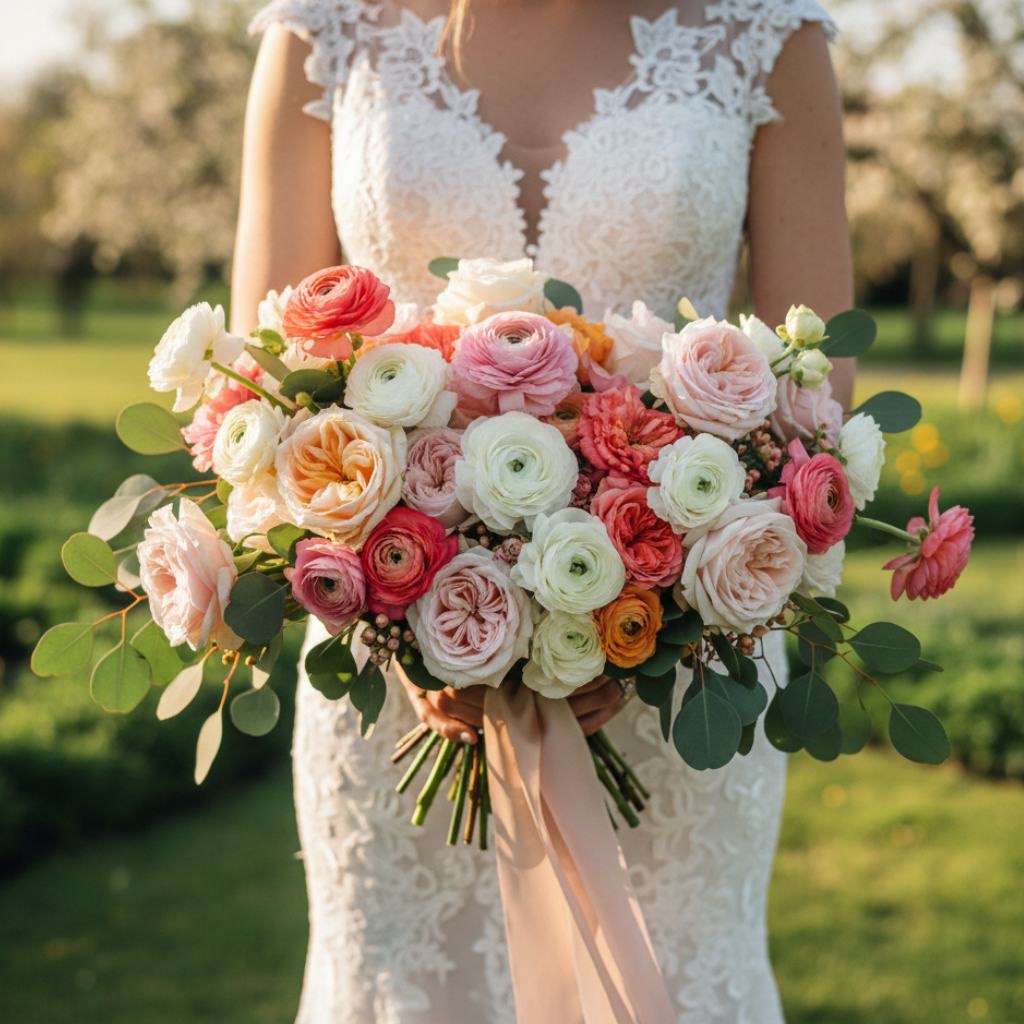 A loose, unstructured bouquet with a mix of wildflowers – daisies, cosmos, sweet peas, ranunculus and greenery. This will feel and look like its been freshly picked from a meadow. Perfect for bohemian or garden style spring weddings.