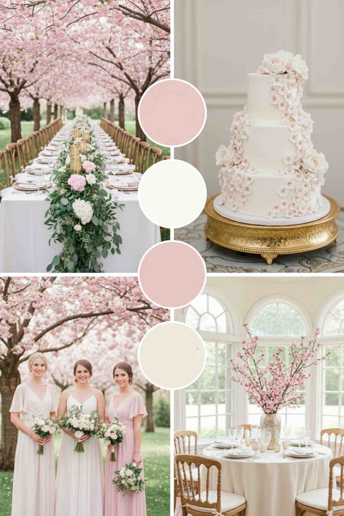 Soft pink paired with white and metallic gold accents feels elegant and distinctly spring. The pink doesn’t have to be literal cherry blossoms (though those are stunning if you can get them) – any blush or light pink flowers work beautifully.