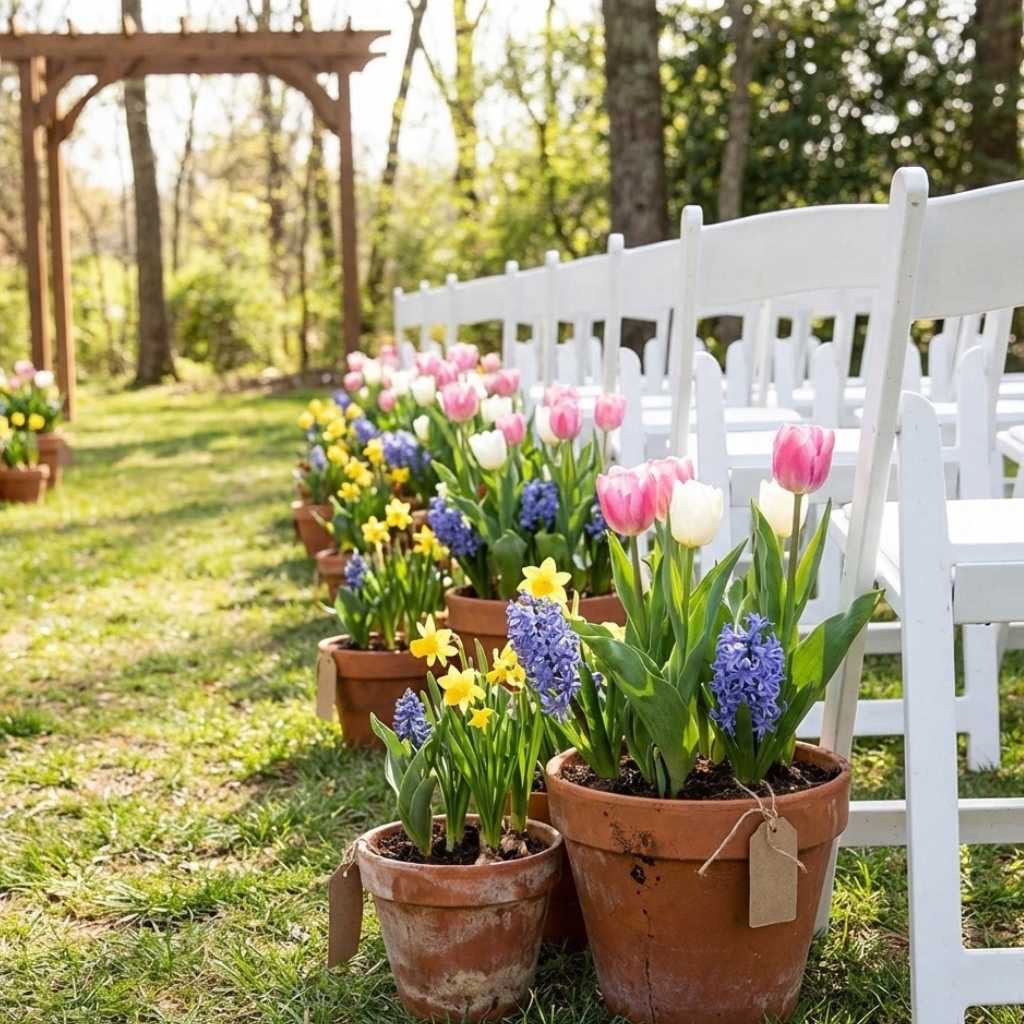 Potted Spring Flowers as Aisle Markers