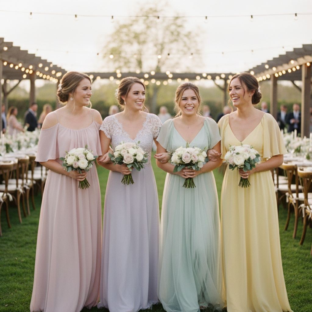 Lightweight chiffon bridesmaid dresses in soft spring colors. The flowing fabric looks beautiful in outdoor settings, especially when there’s a breeze. Perfect for garden or vineyard spring weddings where you want that romantic and airy feel.