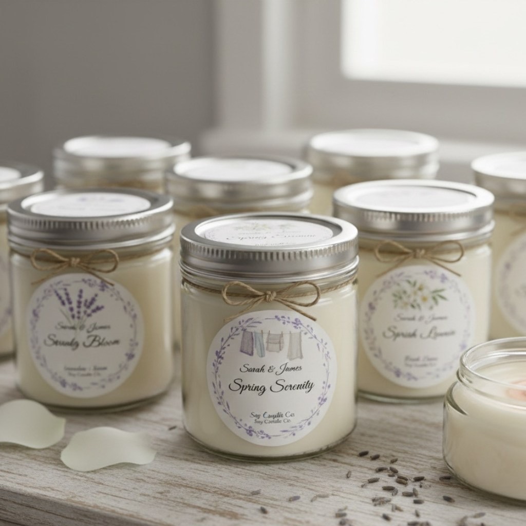 Soy candles with spring scents (lavender, jasmine, fresh linen) in glass jars with botanical labels. Practical, useful and guests can burn them at home while thinking of your beautiful spring wedding.