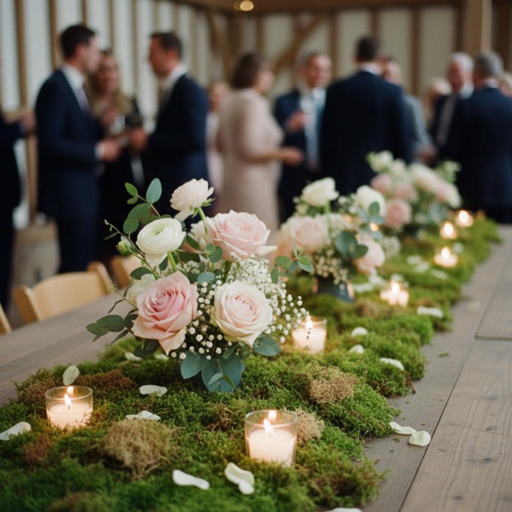 Use moss as a base (either in wooden boxes or directly on tables) and nestle small flower arrangements into it. Add votives for candlelight. It makes a woodland, spring feel that gives the impression you brought the garden indoors.