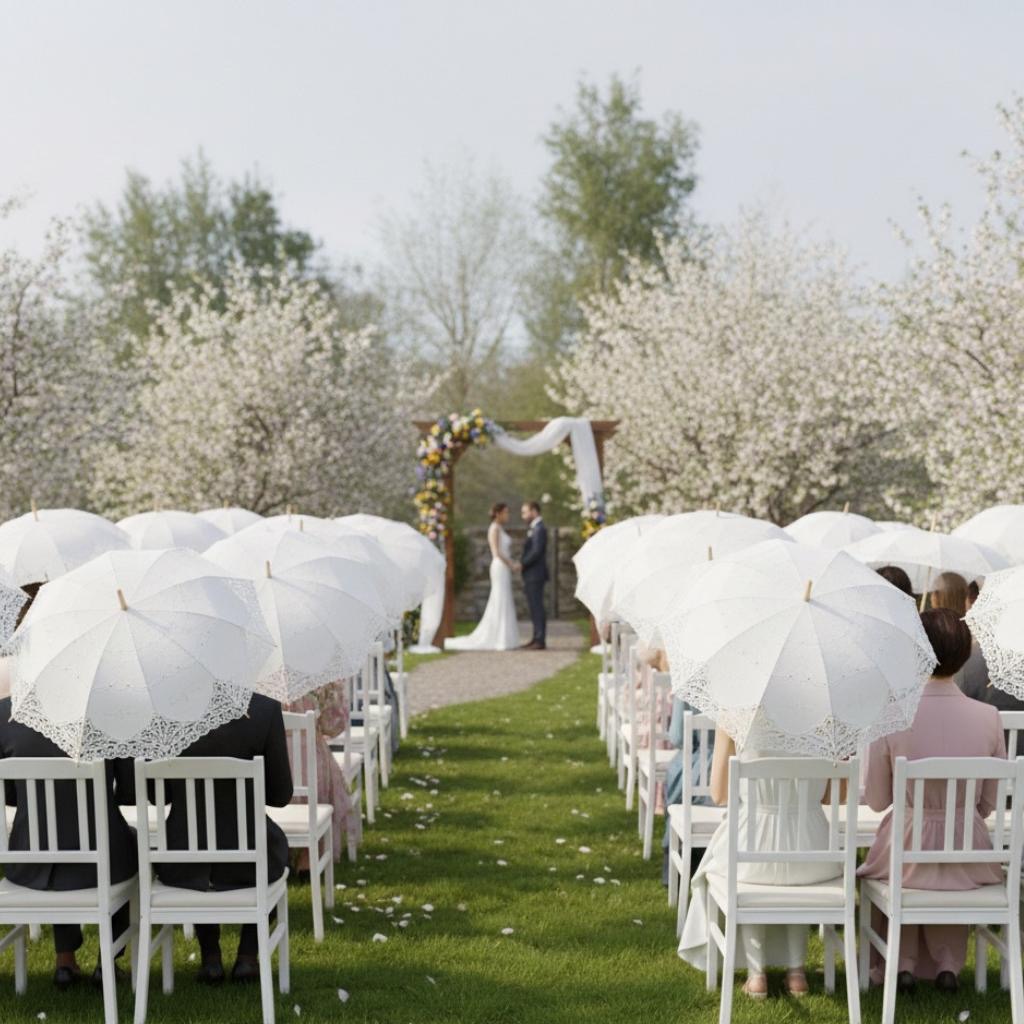 Give guests pretty parasols or umbrellas at outdoor spring ceremonies. They’re practical (sun protection or rain backup) and they add a garden party feel to your photos. You can find affordable ones in bulk online.
