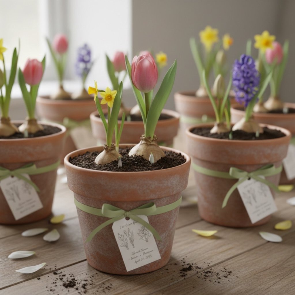 Small pots with spring bulbs (tulips, daffodils or hyacinths) that guests can take home and plant. They’ll bloom the following spring and remind guests of your wedding. More special than some generic favors nobody really wants.