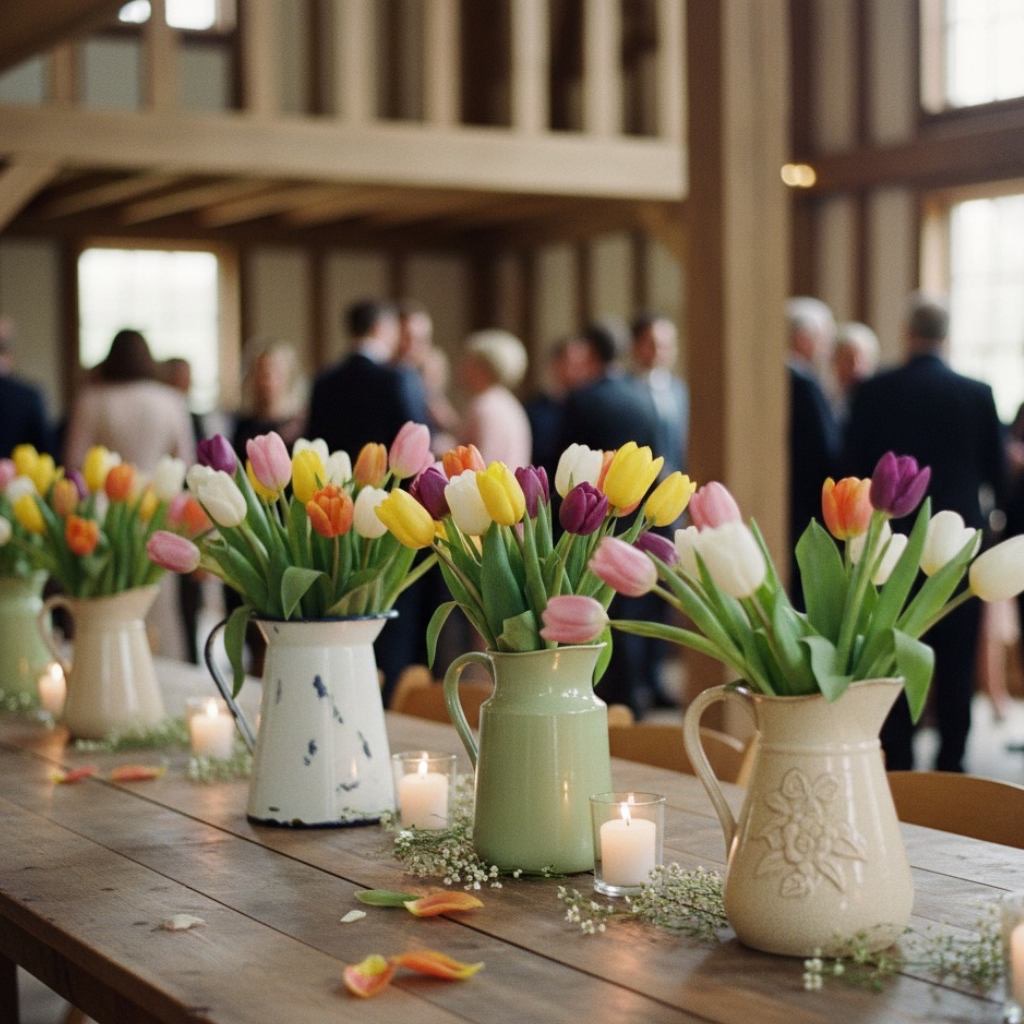 Tulip Filled Vintage Pitchers