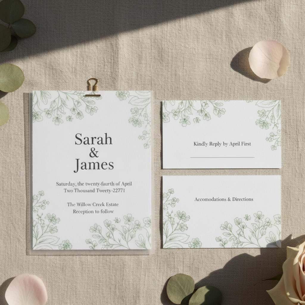 Add a vellum overlay to your invitations with a delicate botanical or floral design printed on it. It adds some depth and dimension and the translucent quality feels elegant and very modern. Works very well with spring themes.
