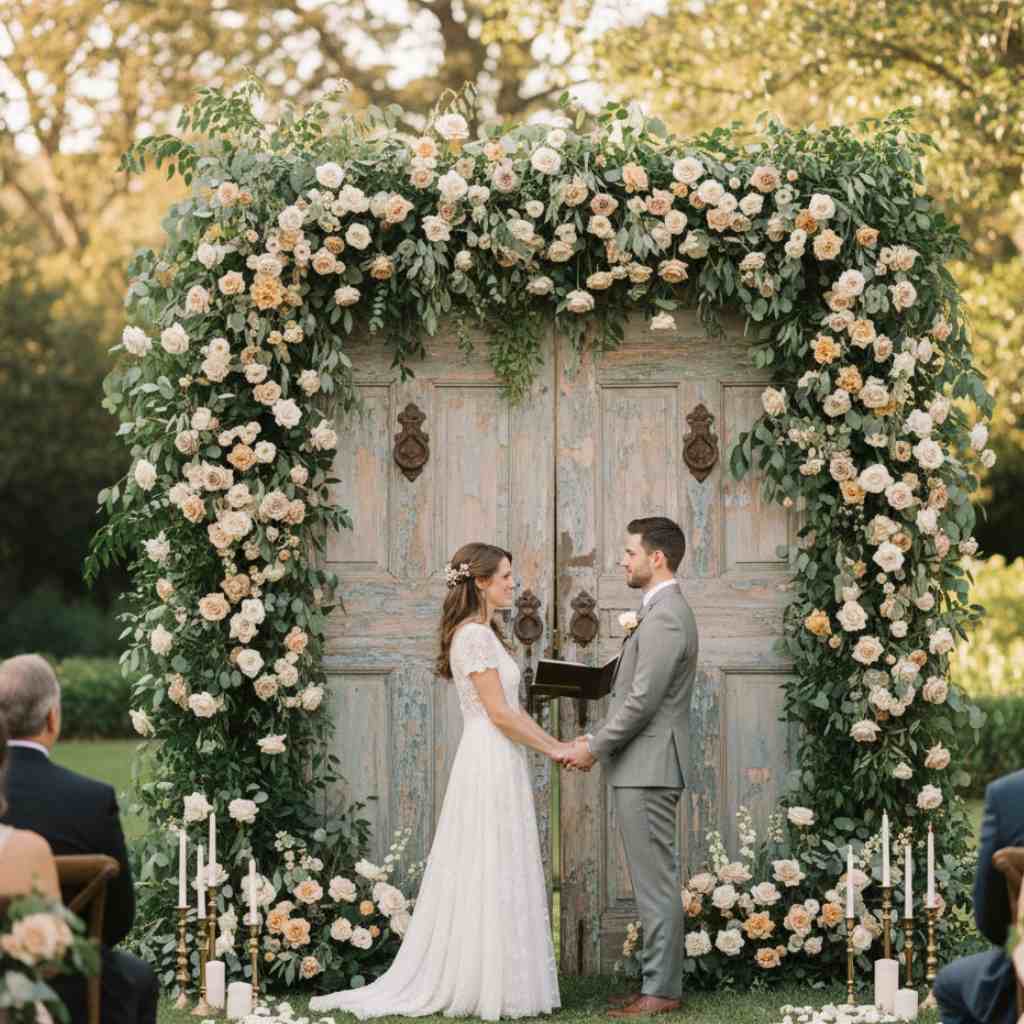 Old doors make a beautiful and symbolic ceremony backdrop. Their weathered paint, textured wood, and vintage hardware create a charming frame for your vows. Add soft florals or greenery to tie everything together.