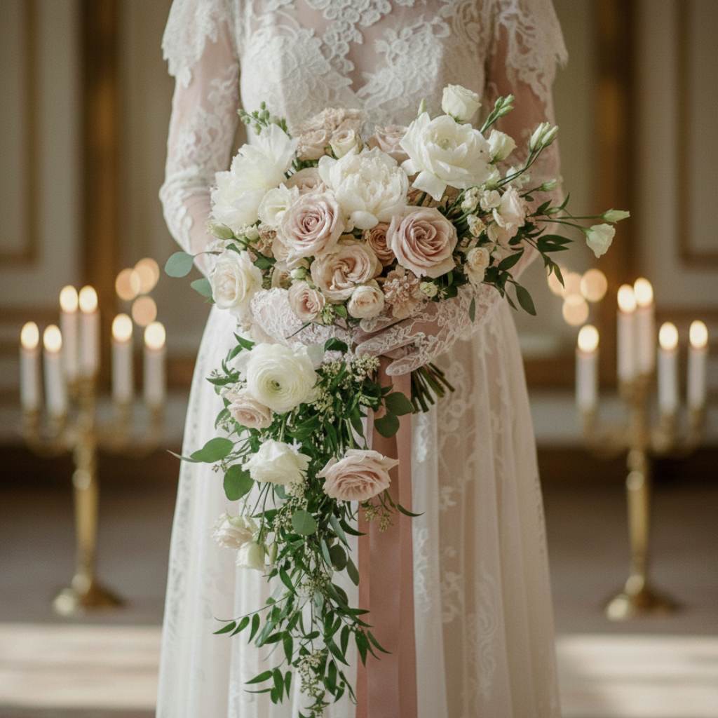 Cascading bouquets are a dramatic throwback to classic wedding styles. They have long, trailing flowers and greenery that spill downwards.
