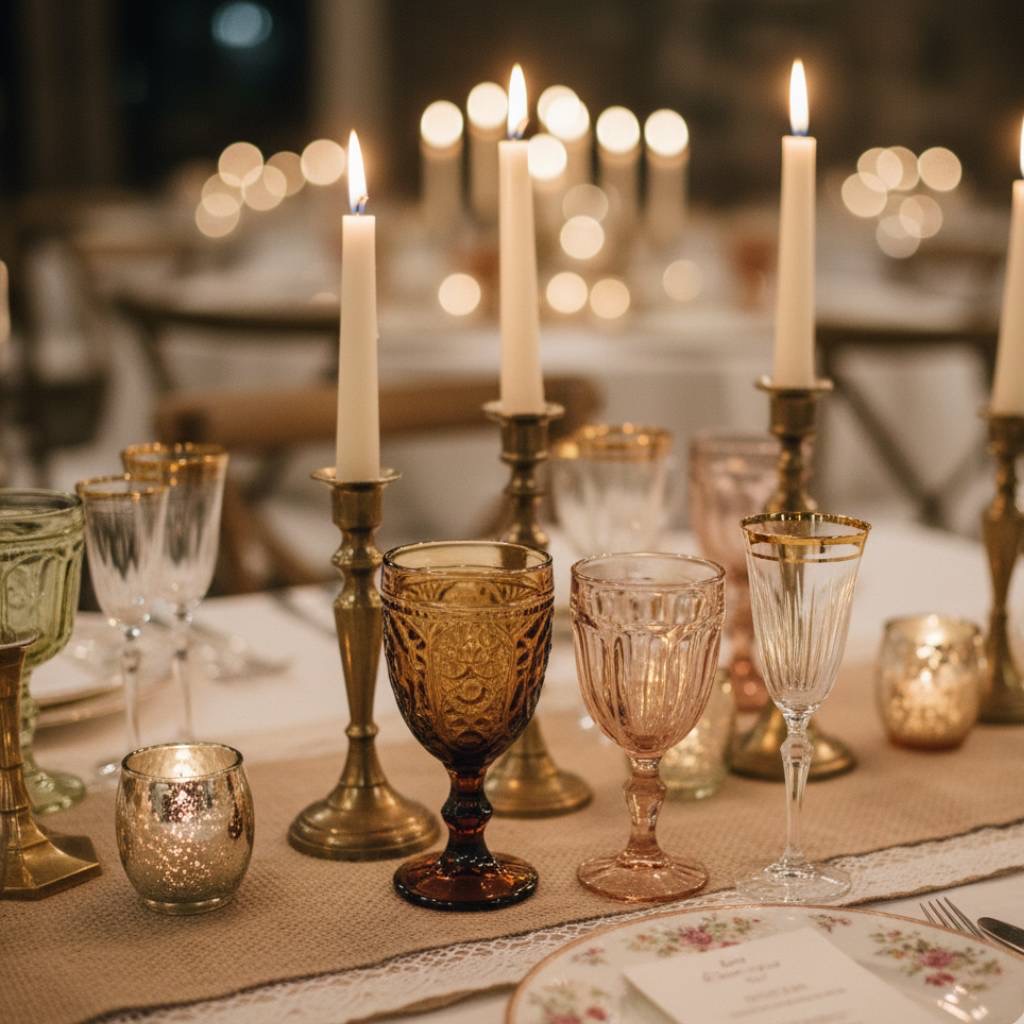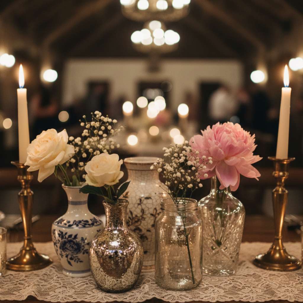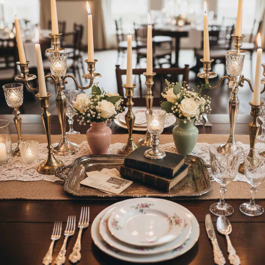 Thrift stores are goldmines for vintage weddings. You can find brass candlesticks, lace linens, old books, vases, frames and trays for a fraction of the cost – all with authentic character built in.