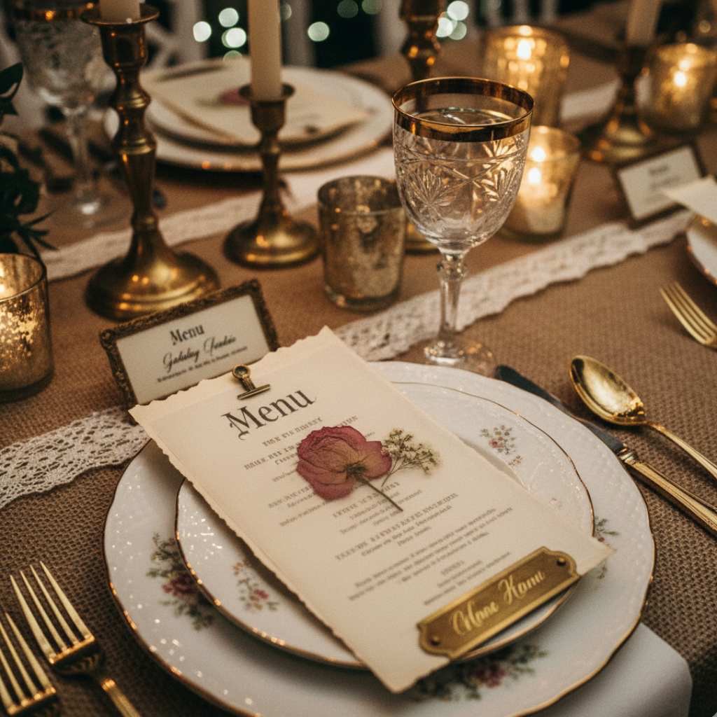 Vintage typography, vellum overlays, pressed florals or parchment style menus add beautiful nostalgic detail to your place settings.