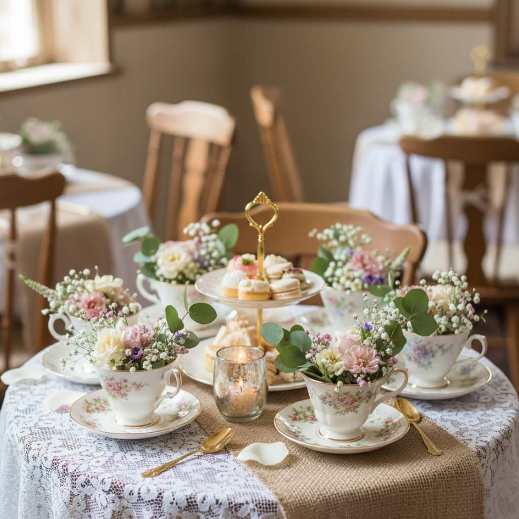 Fine and dainty teacups filled with tiny flowers or greenery make for charming centerpieces. They’re especially beautiful for small round tables, dessert displays or high tea inspired weddings.