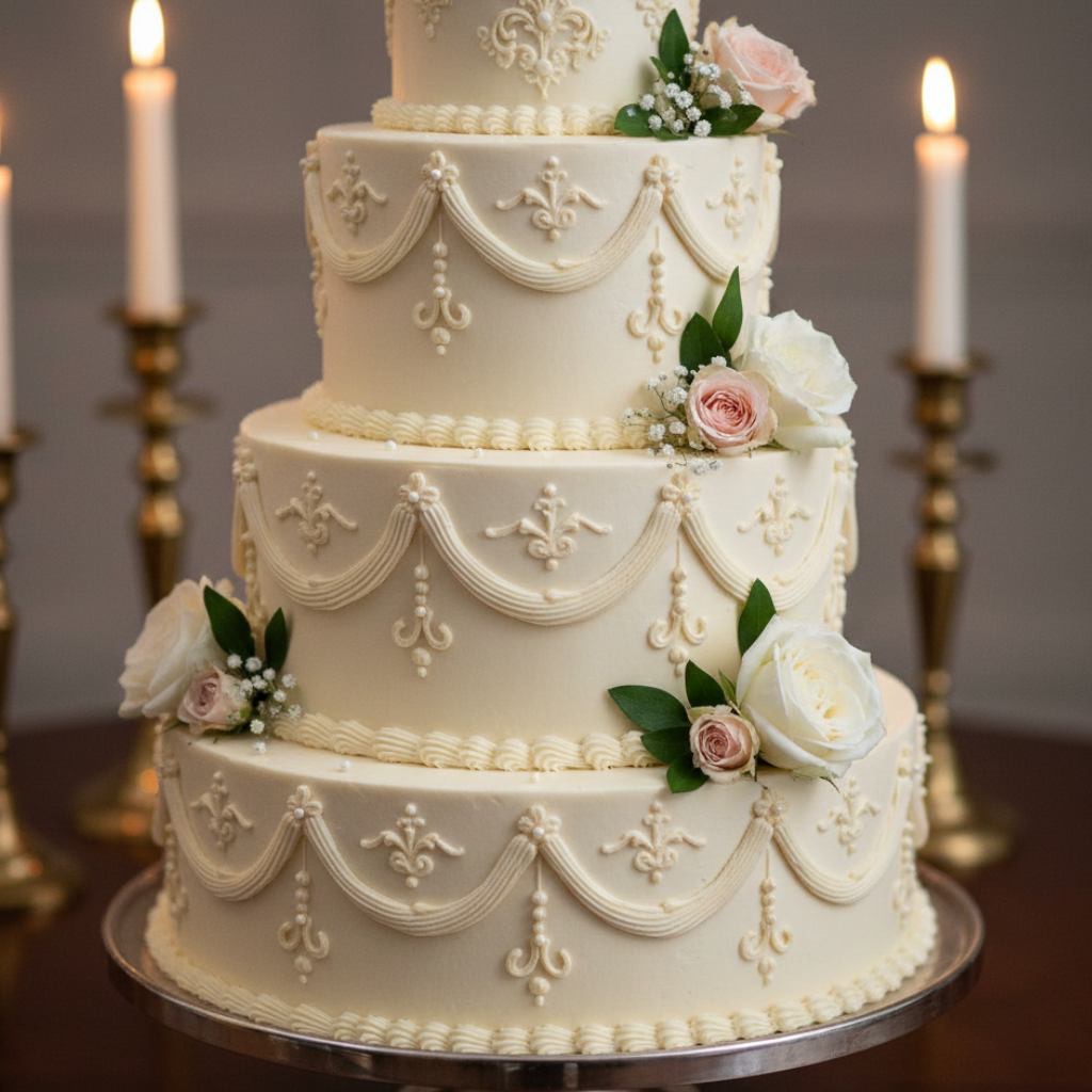 Lambeth piping, smooth ivory frosting, delicate pearls and simple floral accents bring back the timeless beauty of traditional wedding cakes.