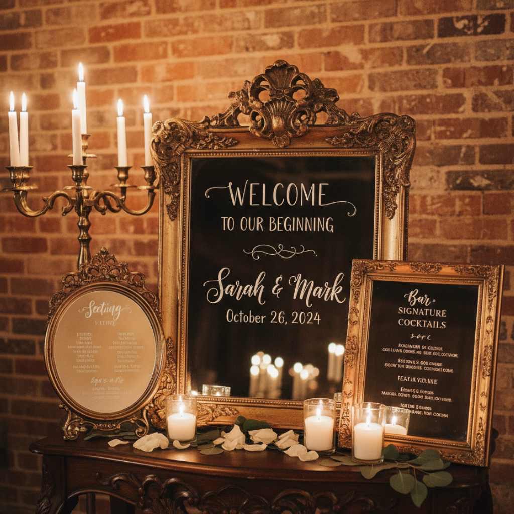 Vintage mirrors with ornate gold, brass or carved frames make absolutely gorgeous signage. When you have them with calligraphy writing they are wonderfully elegant and intimate.