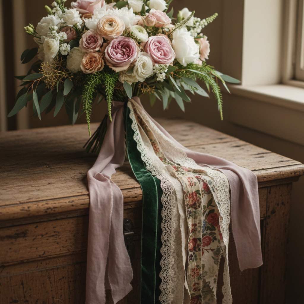 Ribbon is the finishing touch that ties a vintage bouquet together. Long silk ribbons, lace trims, velvet ties, or even antique fabric scraps all will look amazing. Let them drape naturally for a whimsical flow that looks dreamy in your photos.