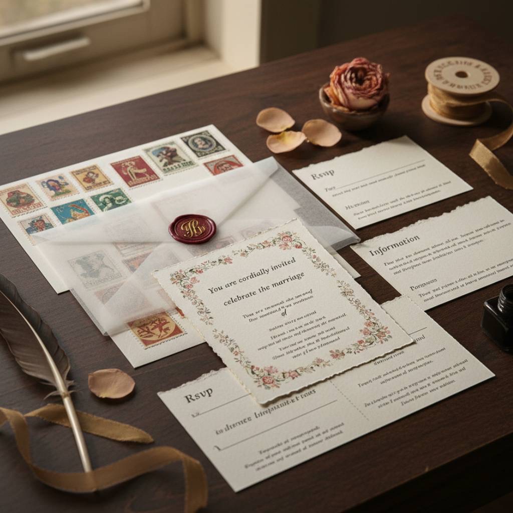 So letterpress invitations, wax seals, torn edges or vintage stamps. These details carry the vintage theme from the very first guest touchpoint.