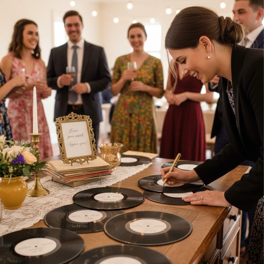 Have guests sign vinyl records instead of a traditional book. You can then hang them at home or frame them afterward – they become a meaningful lifelong keepsake.