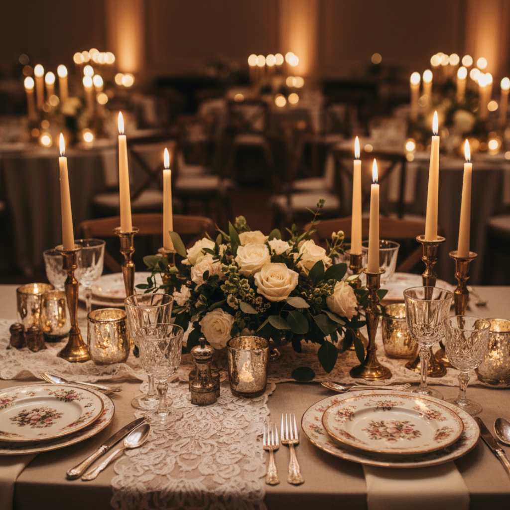The delicate patterns catch candlelight beautifully and work especially well for sweetheart tables, desserts and guestbook setups. Lace turns a simple table into something nostalgic and feminine.