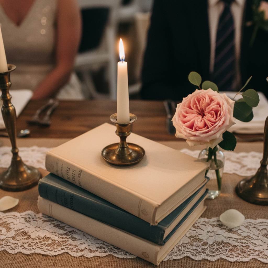 Put a candle or some small flowers on top of the stack of books. This idea works beautifully for literary couples or anyone who loves small details.